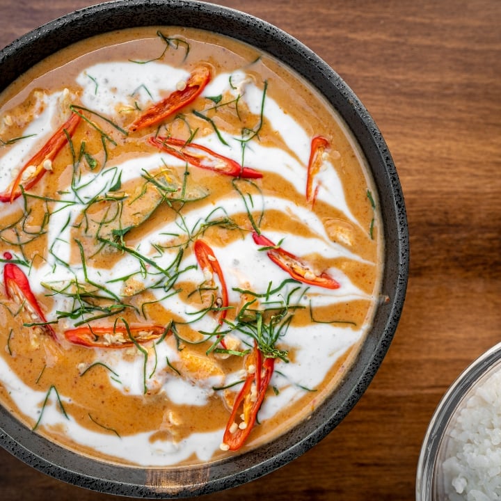 Curry base coconut milk, green bell peppers, and Kaffir, lime. Choice of protein. Served with jasmine rice. Gluten free and vegan.